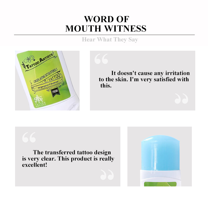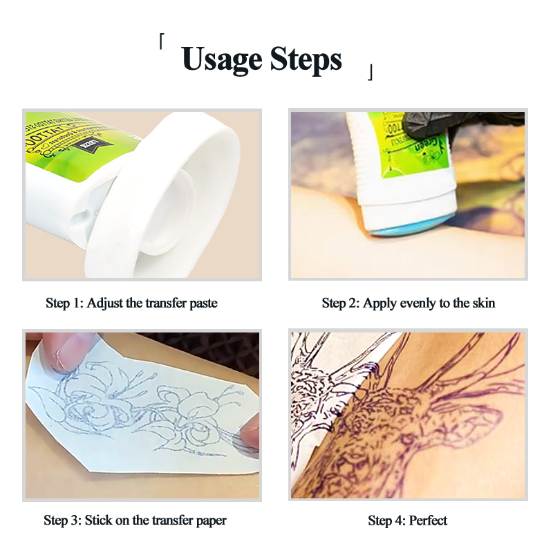 1.[Safeingredients]The tattoo transfer grease has safe ingredients. It does not contain chemical substances, and it has a certain moisturizing effect on the skin. 2.[Fast and Convenient]With our professional transfer cream gel, you can achieve quick and easy transfer of tattoo stencil onto the skin. It is the best choice for temporary tattoos and body art makeup. 3.[Best Effect and Durable] Our transfer cream gel ensures a clear and long-lasting transfer paste effect. The pattern will not easily fade or be erased, which makes it ideal for creating realistic tattoos on wrist, leg, back, arm, collarbone, neck, face, and other parts of the body. 4.[Easy to Use]Firstly, clean and dry the location where the tattoo is needed, and then apply a layer of transfer paste,then put on transfer paper helps transfer your stencil onto the skin, make semi-permanent tattoo with tattoo machine. 5.[ Wide Range of Application] Our tattoo transfer cream gel is suitable for use with transfer paper, and can be directly and evenly applied to the skin. It is perfect for creating gorgeous and realistic tattoos on various parts of the body.